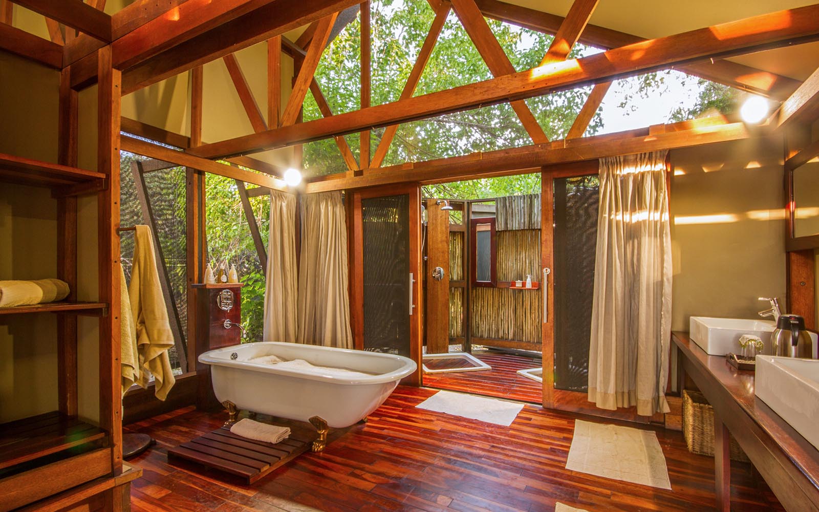 The tents each have their own sundeck that leads to an entrance foyer with a reading and writing area, en-suite bathrooms with Victorian clawfoot bathtubs, "his and hers" washbasins and flush toilets. The bathrooms lead out to a reed enclosed open-air shower with hot and cold running water.
