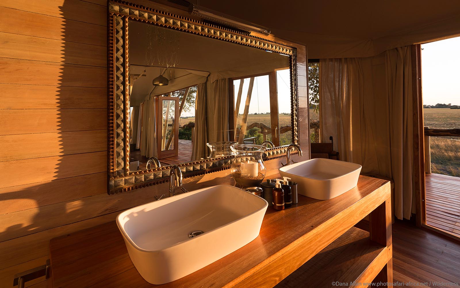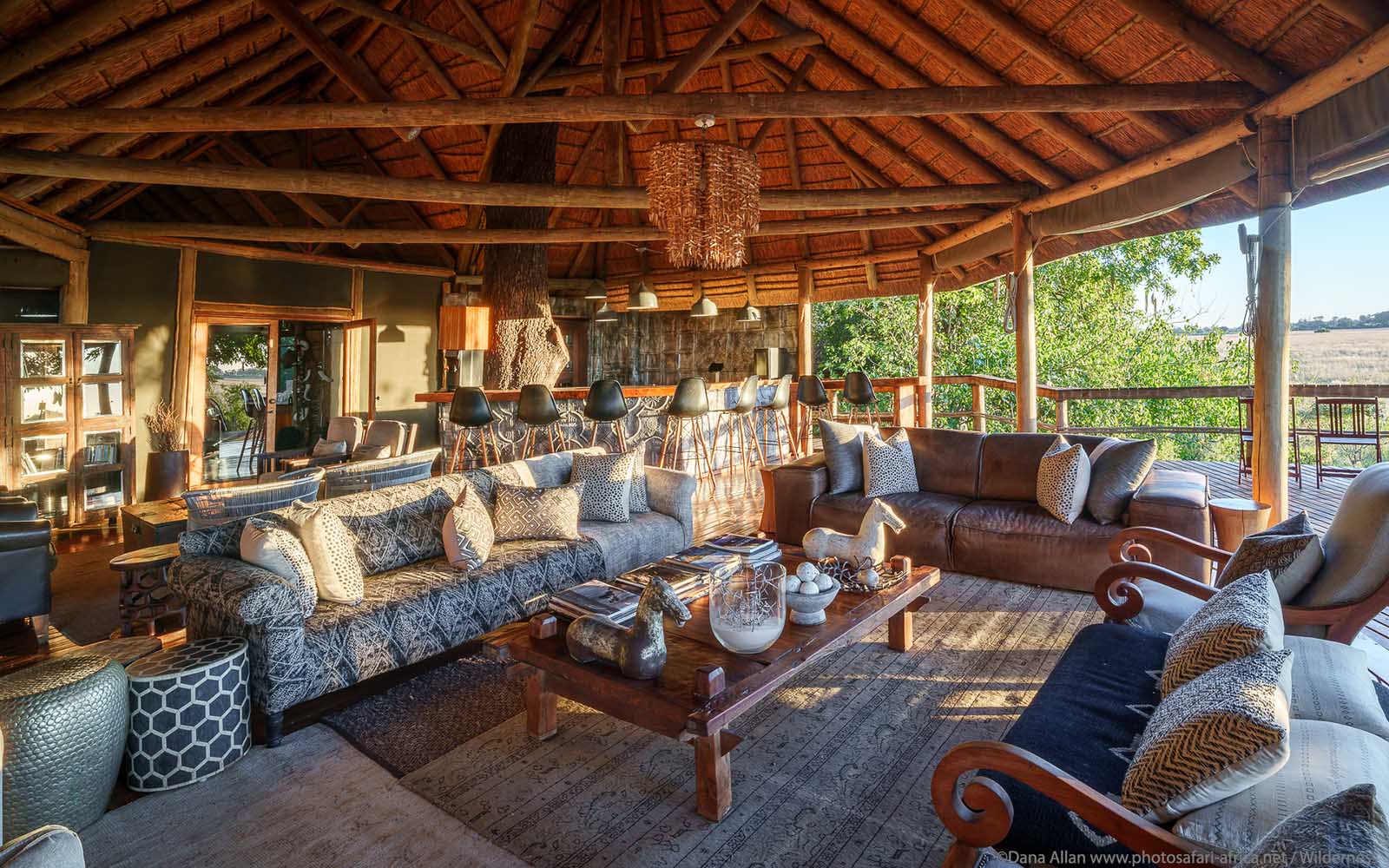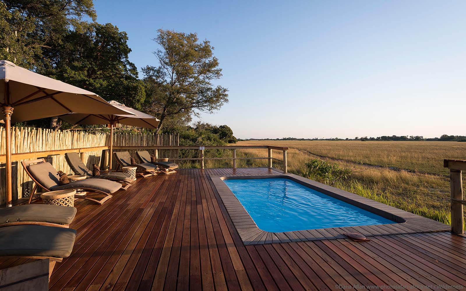 The bar, restaurant and lounge are all under a large thatch with open decking built around the trees. There is also a small swimming pool built just above the floodplain. The camp and each room looks out from the shade of the trees over an enormous grassland floodplain on which a wide range of animals gaze and predate.
