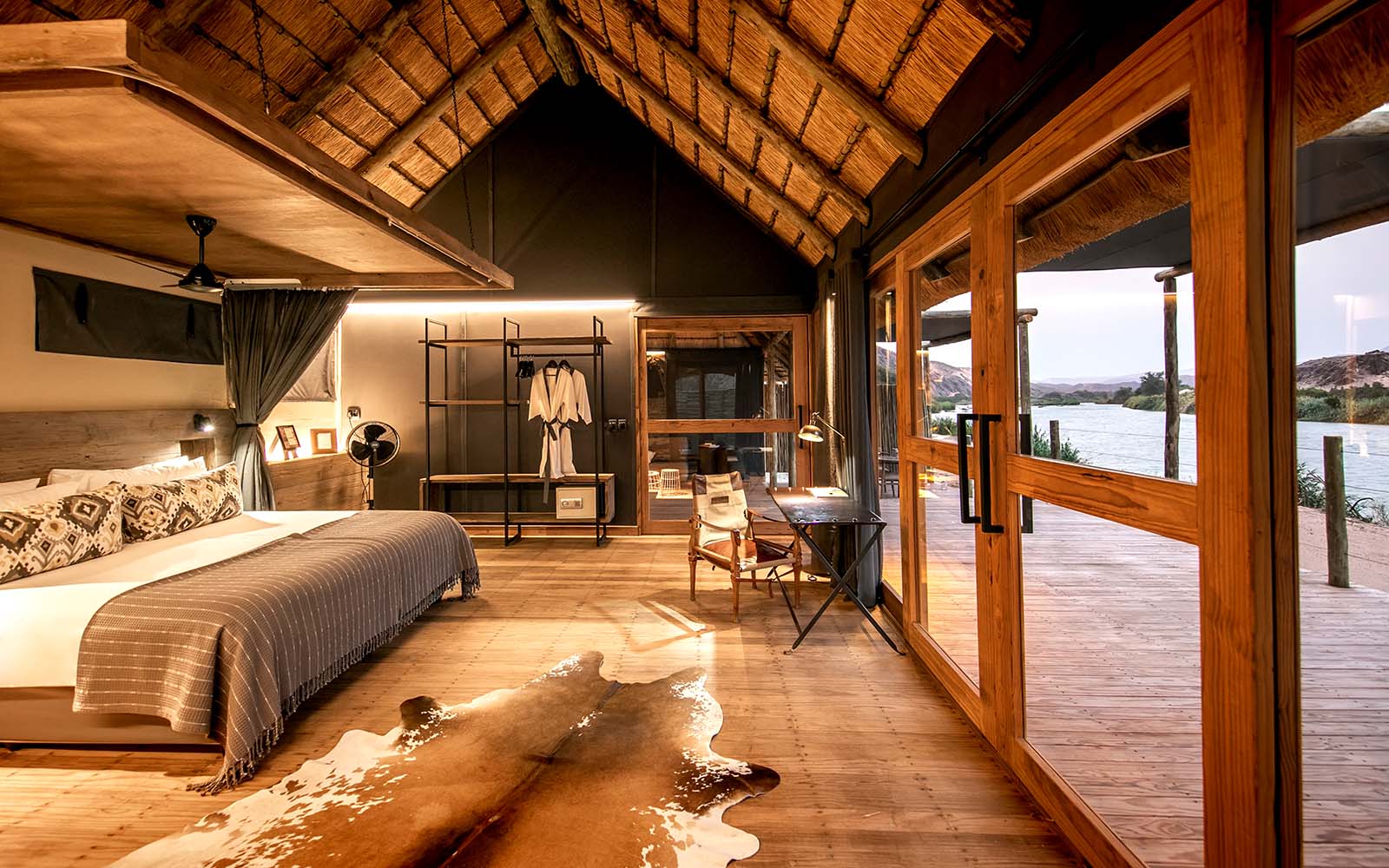 The 9 canvas and thatch deluxe chalets with wooden viewing decks are perched on the river bank overlooking the Kunene River.