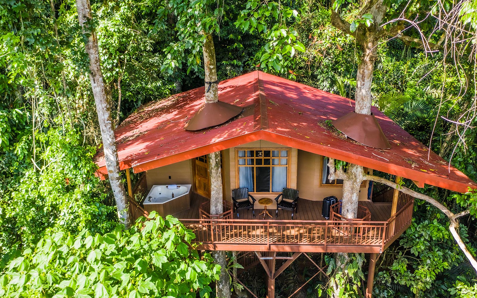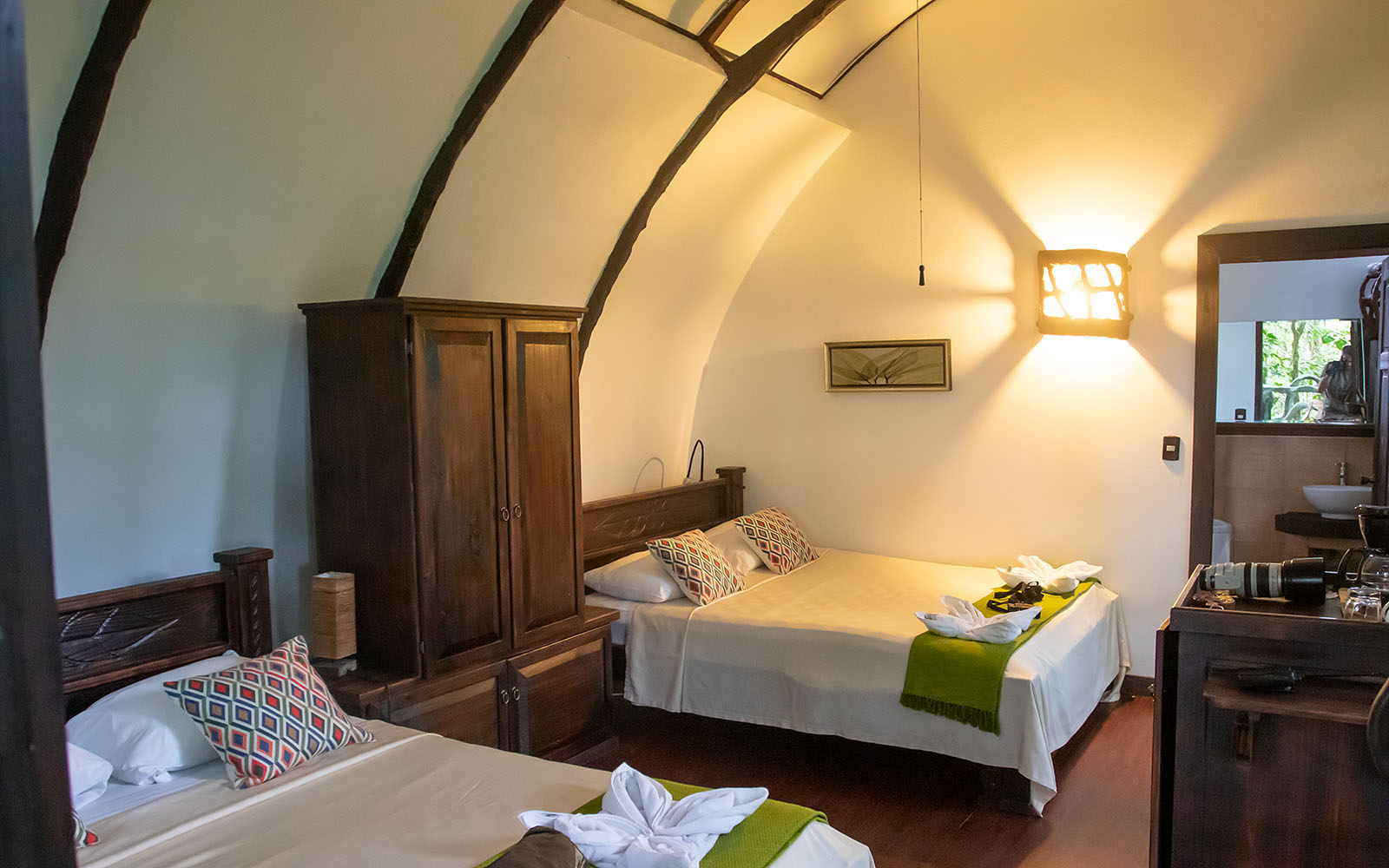 Beyond in the rainforest are some hidden gems; treehouses, constructed around 17m above the forest floor and part-way to the canopy. Each is reached by a series of steps and on arrival at the top you have an outside sitting area and an open, screened bedroom from which you can have a completely immersive experience listening to the sounds of the night and perhaps early morning wake up calls from a local troupe of howler monkeys. These elevated rooms have the luxury of an en suite, having inside as well as outside showers.