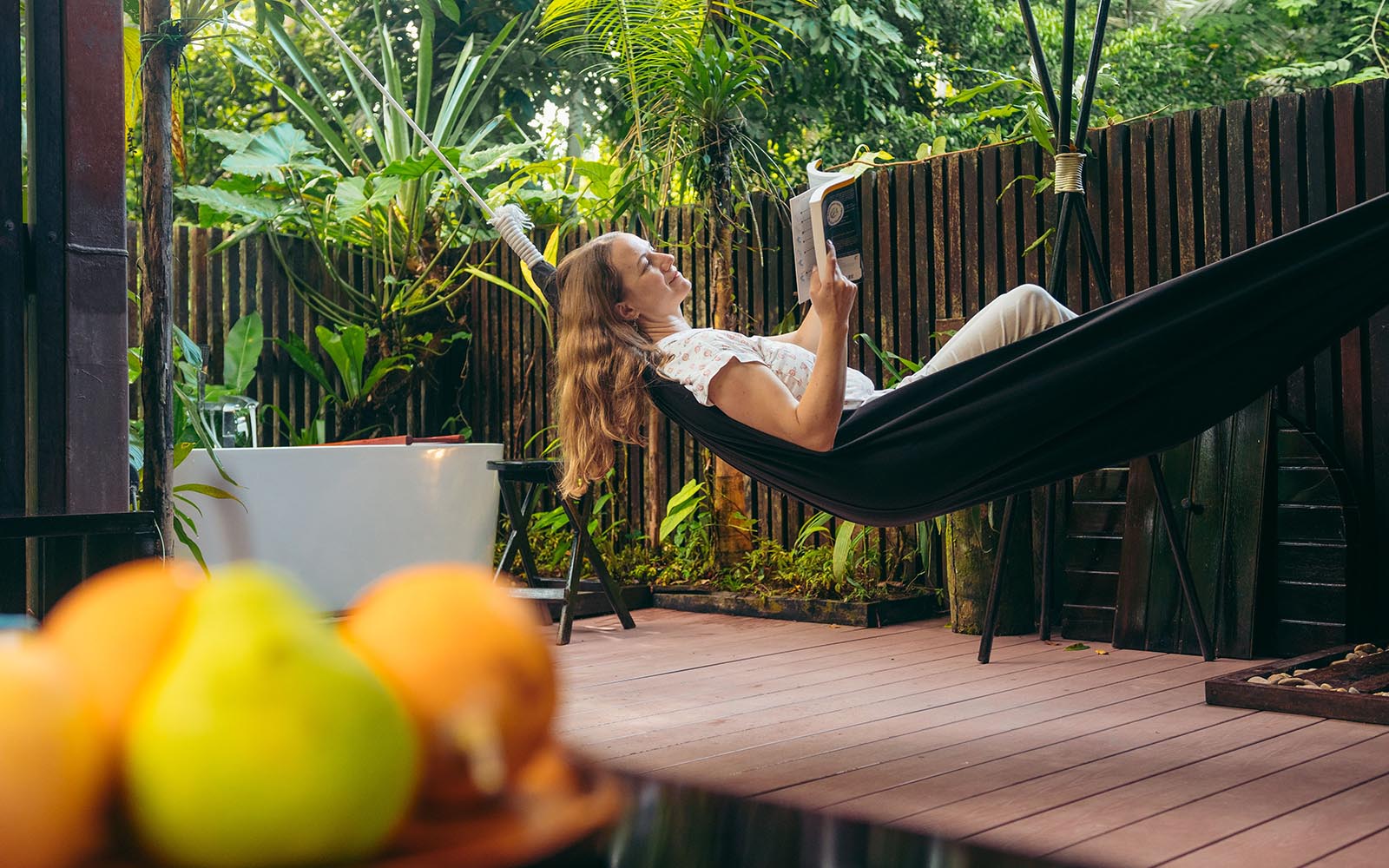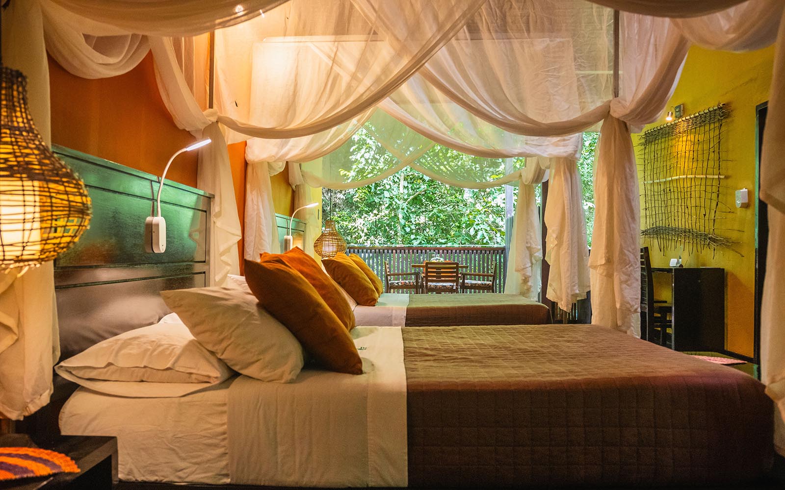 The lodge itself comprises of a large open dining and lounge area where time is spent relaxing in the middle of the day and during evenings. Along raised wooden walkways are the rooms in 4 different categories from "comfort" to "deluxe suites". All are open air to the forest to let any breeze through and all beds have mosquito nets. All rooms have en suite bathrooms with a hot shower. The deluxe suites come with an additional outdoor bath tub.
