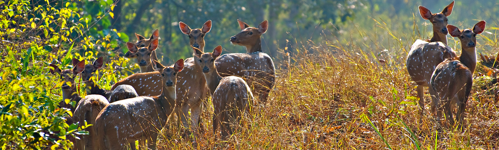 Kanha is a large national park covering the Maikal hills and a tiger reserve of varied landscapes, much of it little visited by tourists. It is a beautiful park to travel through. Originally created as a reserve to protect barasingha, or swamp deer, it is home to many tigers, leopard, wild dogs, sloth bear, gaur or Indian bison and a vast array of bird life. Elephant back safaris to see tigers are possible here as well as game drives.