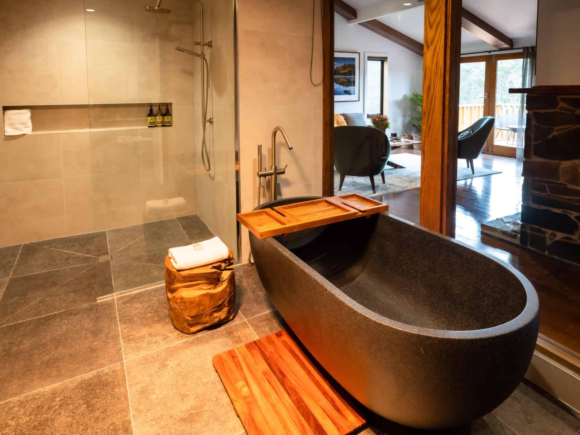 4 different styles of cabin accommodation are placed throughout the grounds, connected by timber boardwalks where the wallabies and wombats aren't afraid to wander. From the cosy yet contemporary Pencil Pine Cabins through to the luxurious and expansive King Billy Suites complete with outdoor hot tub on the ample deck, whichever accommodation style you choose you will be privy to exceptional service during your stay.