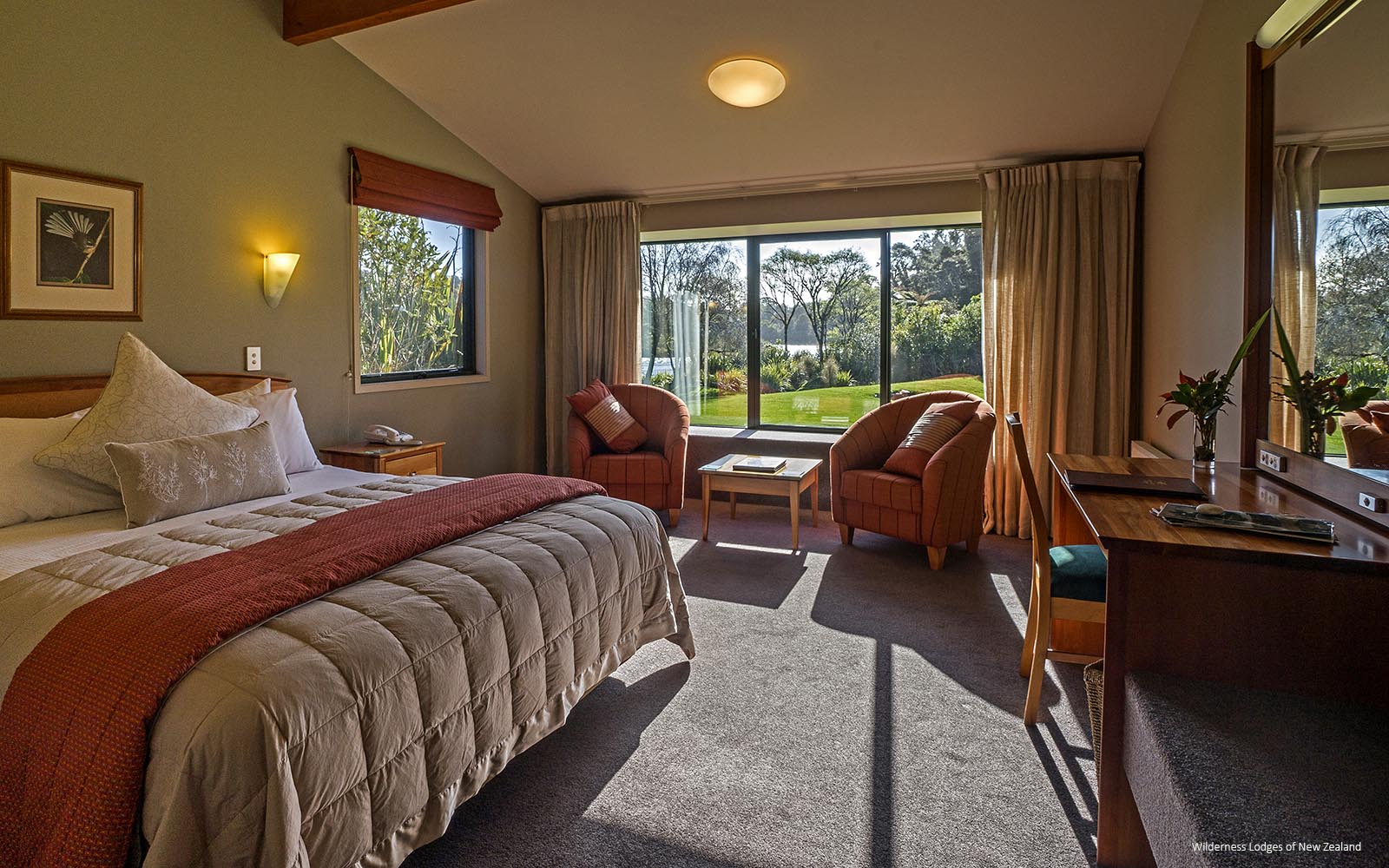 Accommodation at Wilderness Lodge Lake Moeraki is warm and comfortable rather than ultra-luxurious. Rainforest rooms look out to the verdant rainforest and bird watching from your window is a popular past time, while the more spacious premium river view rooms have private decks and beautiful views over the Moeraki River rapids. The Riverside Restaurant offers lovely views, excellent wilderness food and the wine cellar boasts a selection of fine New Zealand wine. You can choose to dine with other guests exchanging stories or dine individually just enjoying the atmosphere.