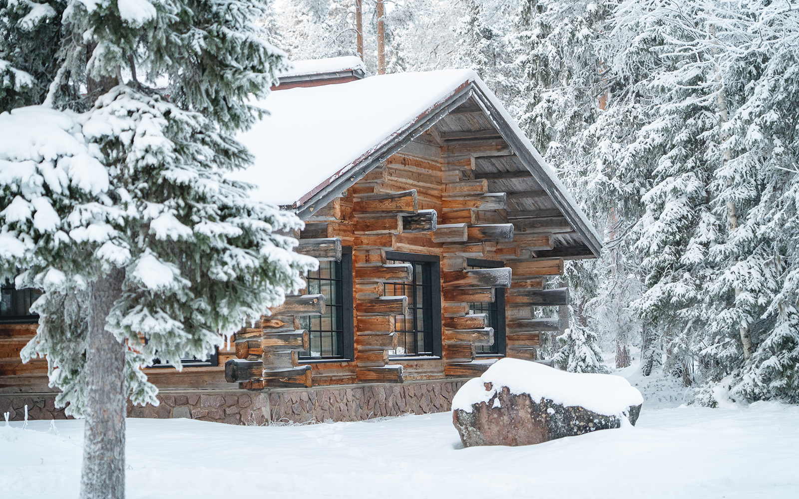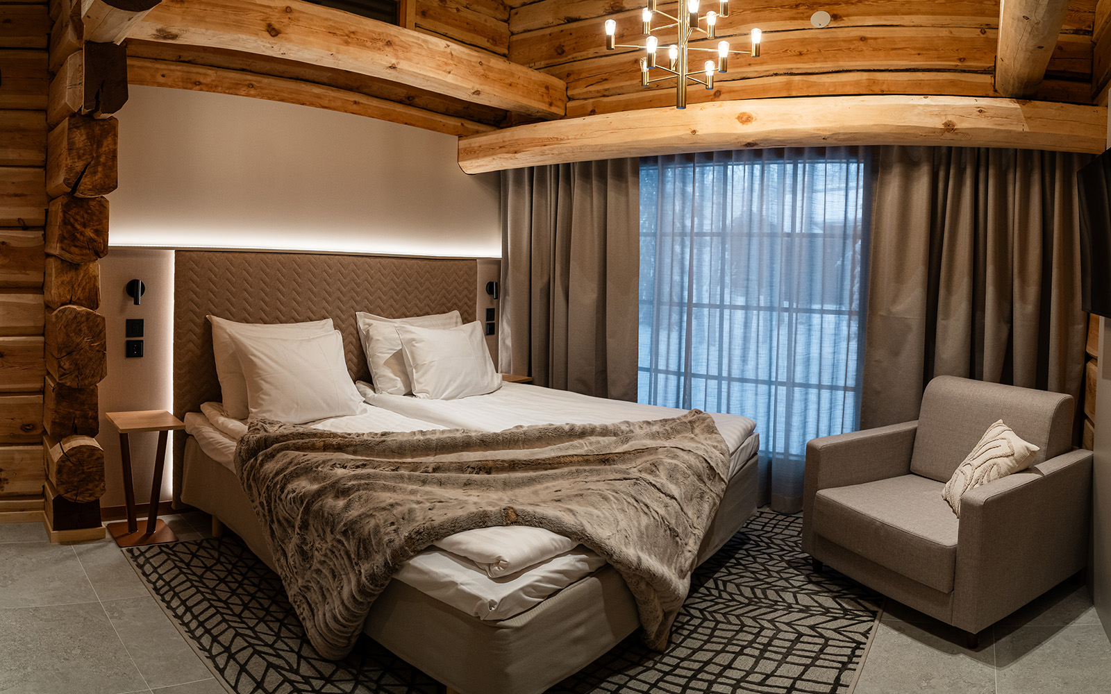 Arctic Deluxe Room - Built in traditional log cabins, the Arctic Deluxe Rooms combine Lappish traditions with modern luxury. Designed with cosy wooden interiors and plush bedding, the large windows boast views to the snow-covered outdoors. Equipped with modern amenities such as flat-screen TV, Wi-Fi and luxurious ensuite bathroom, these rooms provide the perfect balance of comfort and adventure.