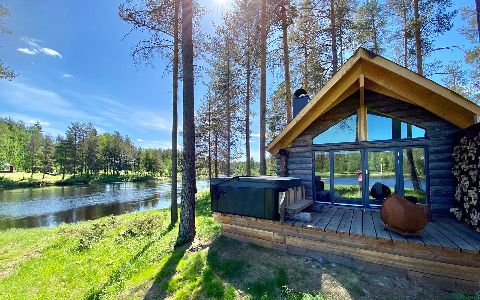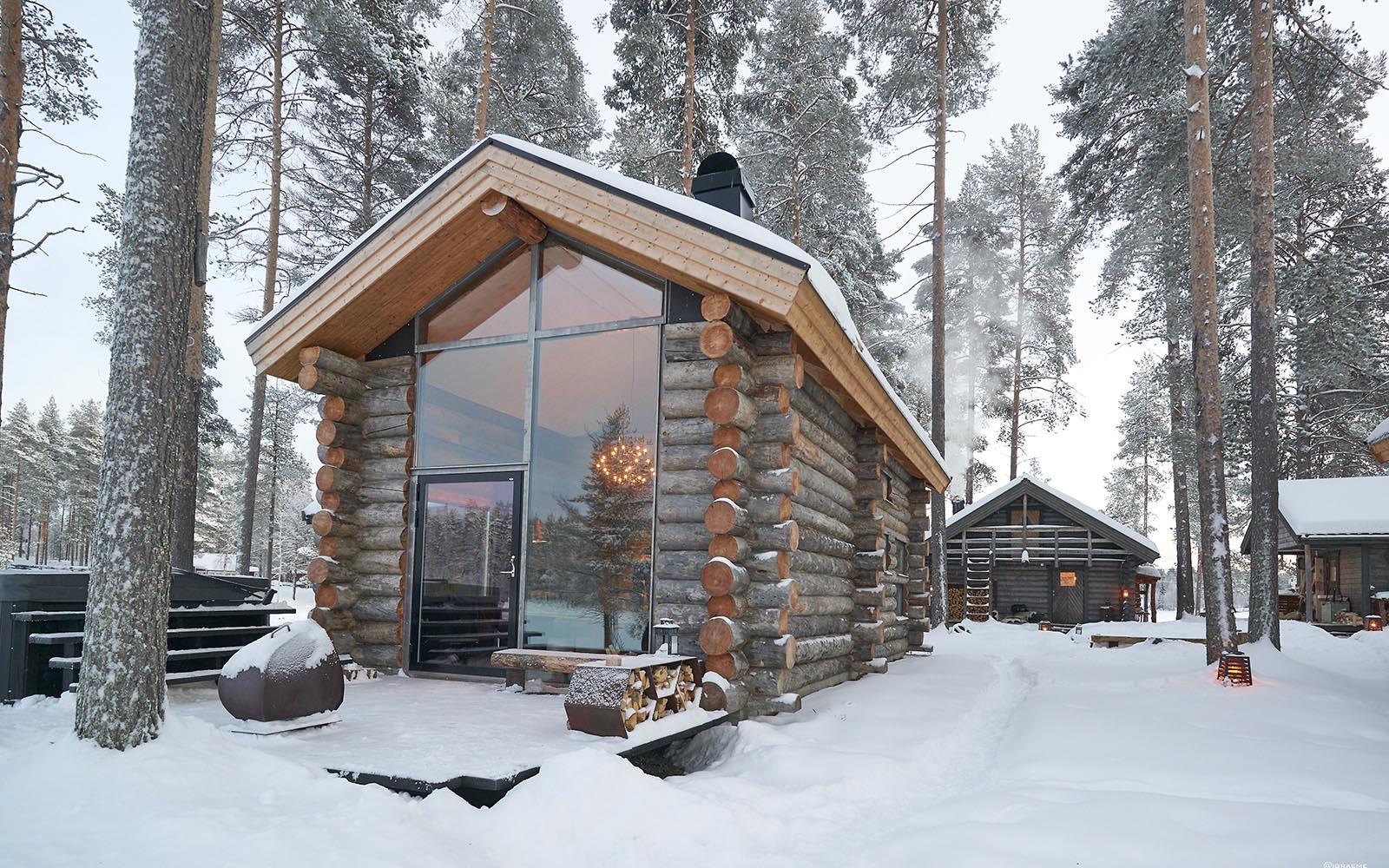 Sitting along the river’s shoreline, the three log cabins - Sun, Wind, and Water - blend traditional craftsmanship with modern architectural design. Each features a striking north-facing glass façade that opens up to the natural beauty beyond. Inside, all cabins offer the same modern comforts, including an ensuite bathroom, coffee machine, and wood-burning stove with an ample supply of firewood. Step outside onto your private wooden deck to enjoy a jacuzzi overlooking the river and just a few steps away in a separate log building a wood-fired sauna awaits.