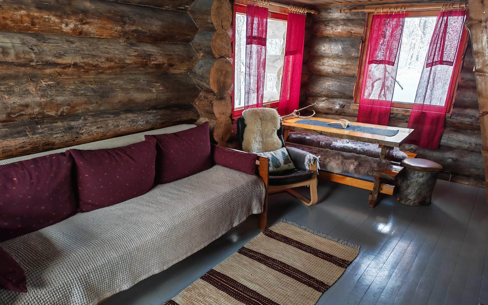 Set beside a frozen lake, the camp offers a back-to-basics yet cosy experience in a shared log cabin sleeping just 6 people, warmed by a wood-burning stove and lit by battery-powered electricity. With no running water, daily life follows the rhythms of the wilderness - drawing water from the ice, gathering firewood, and sharing responsibilities with your fellow adventurers. Evenings are spent in the welcoming glow of the kota, enjoying hearty home-cooked meals by the open fire, swapping stories, and unwinding in the lakeside sauna, with the option of an invigorating dip in the icy water.
