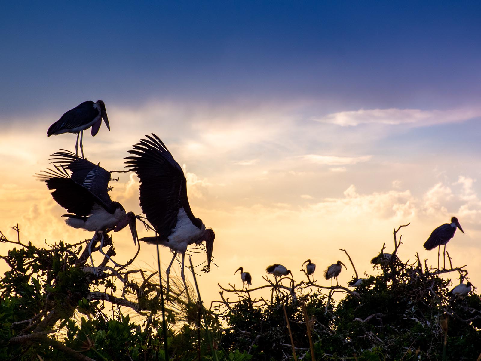By way of contrast we have chosen a full 'wet' camp, Gunn's Camp so that you can experience the magic of the Okavango Delta wetlands before moving north for more land based activities from Lebala. From Gunn's Camp you can take mokoro rides experiencing the wetlands from the water. Bird watch from a boat safari and drift on the river with a sundowner at sunset as the sounds of Africa sing until dark.